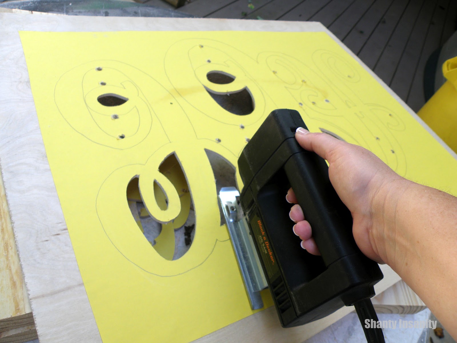 7. I used a jigsaw to cut. It was important to cut out the inside sections first so the stability of the entire piece was maintained for as long as possible. Go very slowly with the jigsaw, and do not try to turn a corner! The blade will break, so it is important to think through how you will make your cuts. I had to stop and add more pilot holes as I went. I just lined up the drill right beside a line so the hole would be in just the right spot for my jigsaw blade to get to the line I was wanting to cut.